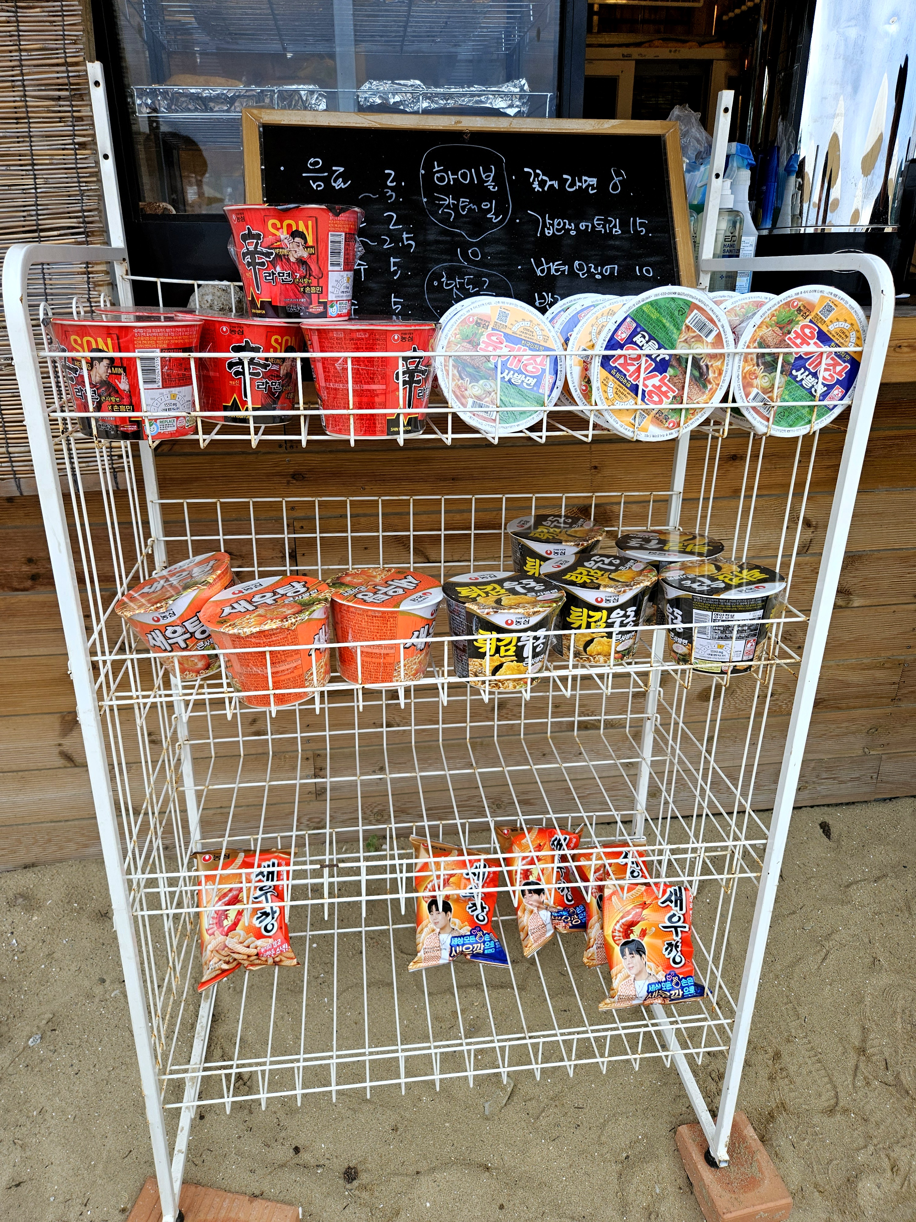 변산 해수욕장의 가장 가운데 부분에 사람들이 앉아서 간식을 먹을 수 있도록 파라솔이 설치가 되어있어 가보았습니다. 그곳은 마치 한국이 아닌 해외여행을 온 기분을 주는 듯한 오두막이 있었고, 오두막에서는 각종 간식거리를 판매하고 있었습니다. 수영을 많이 하다 보면 칼로리 소비가 상당한 거 아시죠? 수영복은 챙겼지만 간단한 간식거리를 챙기시지 못한 분들이시라면 이곳에 방문해서 컵라면 하나 드시는 것은 어떠실까요? 너무나도 달콤한 간식이 될 것 같습니다ㅎㅎ