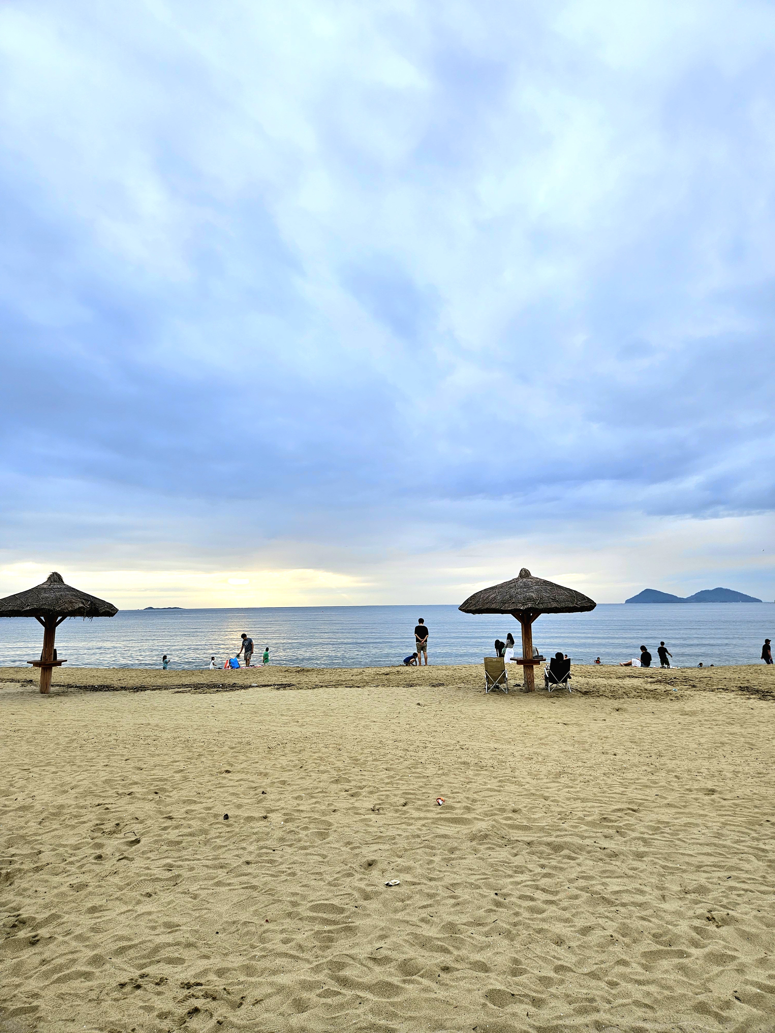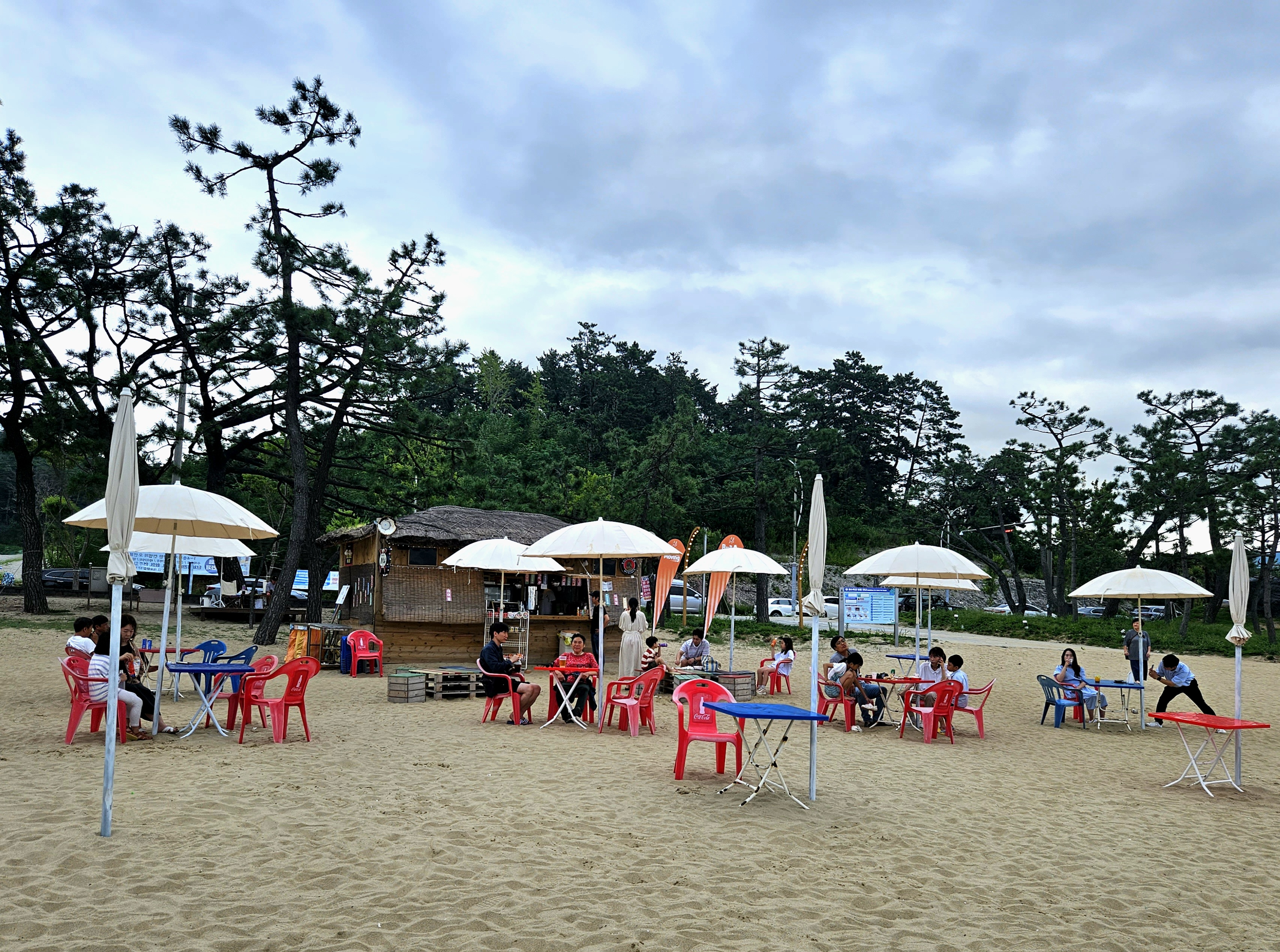 - 주기적으로 청소를 하시는 것인지 아니면 해수욕할 시기가 약간 지난 9월 초인지라 쓰레기가 없는 것인지는 모르겠지만 전체적으로 해수욕장이 다른 해수욕장들에 비해 굉장히 깔끔하다는 느낌을 받았습니다. 가로로 길이가 굉장히 넓은데 왼쪽에는 항구가 붙어있고 오른쪽에는 숲 속산책길이 함께 있어 다양한 체험을 즐길 수 있는 것이 굉장히 인상 깊었습니다. 날씨가 그렇게까지 좋지도 않았음에도 불구하고, 가족단위로 여행 오신 분들이 상당하셨고, 바닷가의 깊이는 아이들이 초입까지는 들어갈 정도의 얕은 물가라고 보시면 될 것 같습니다.