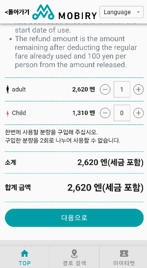 8. 위에는 편도, 아래는 왕복이기에 원하는 것으로 선택하여 구입을 클릭한다.